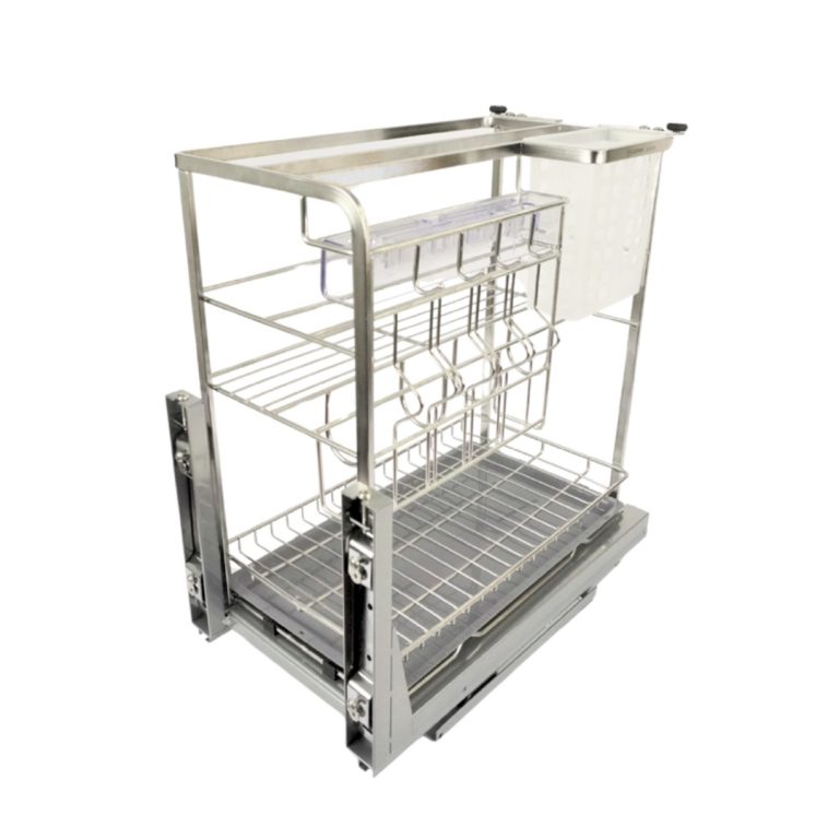 - Trọn bộ gồm: Ray âm giảm chấn (bắt vách tủ), 1 bộ bắt mặt tùy chọn dùng cho cánh kéo, 1 khay hứng nước, 1 bộ rổ